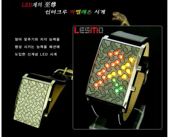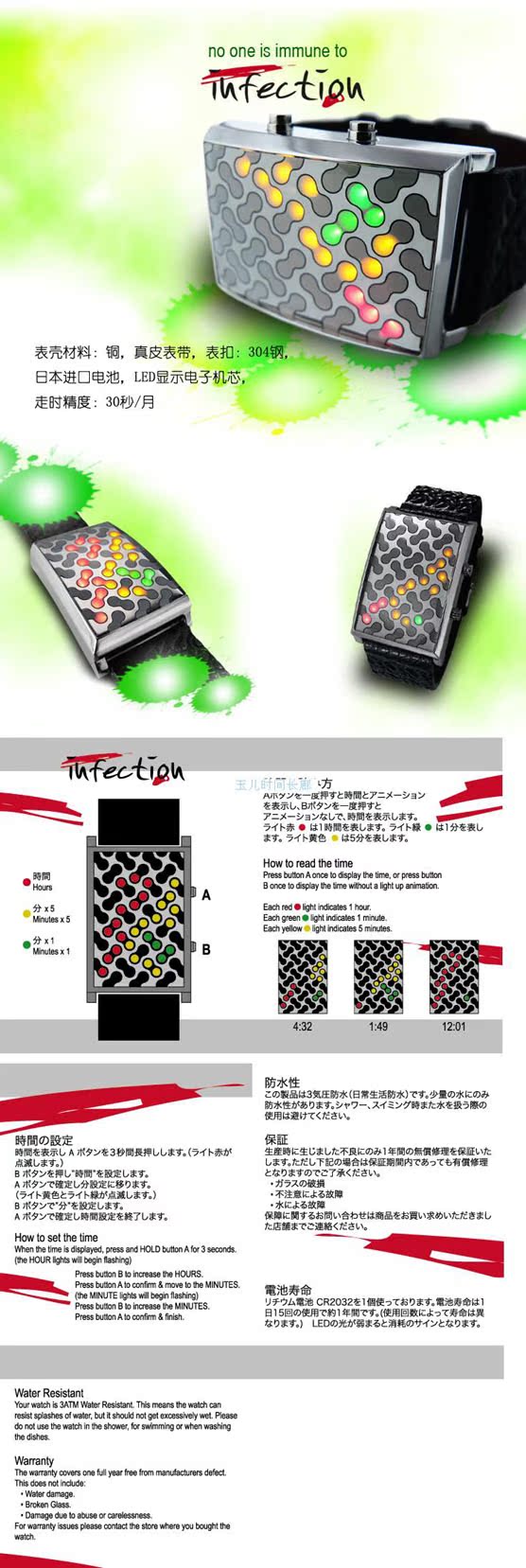 日本手表厂商Tokyoflash 推出的一款名为Infection的LED腕表。其中,12个红色LED灯代表小时(1~12),共12个黄色LED灯,每一个代表5分钟,4个绿色 LED灯分别代表1分钟,要读出准确地时间,就要进行简单地加法和乘法,这就是因为酷而付出的一点点代价。这款LED腕表在日本本土售价为135美元